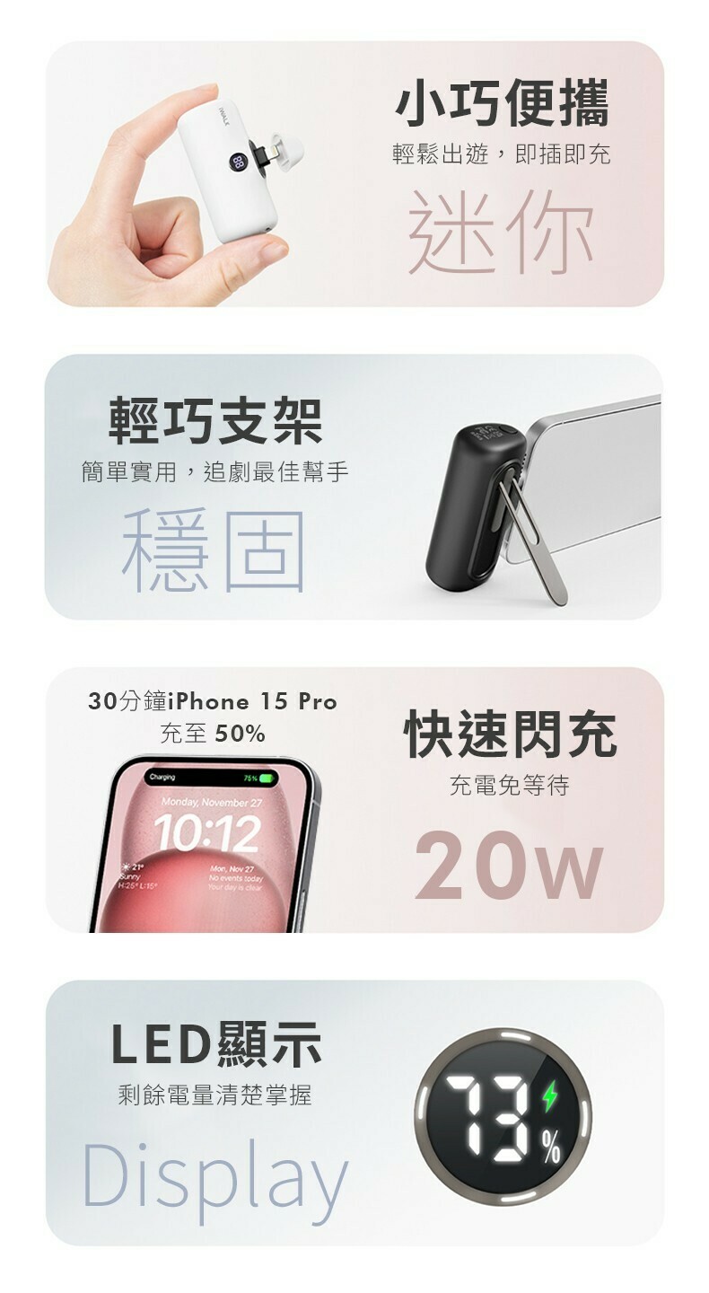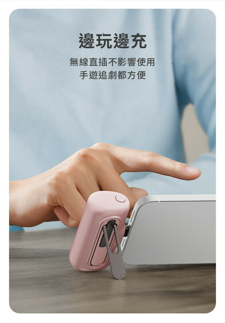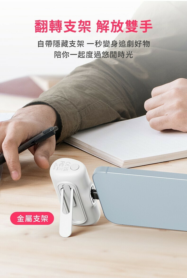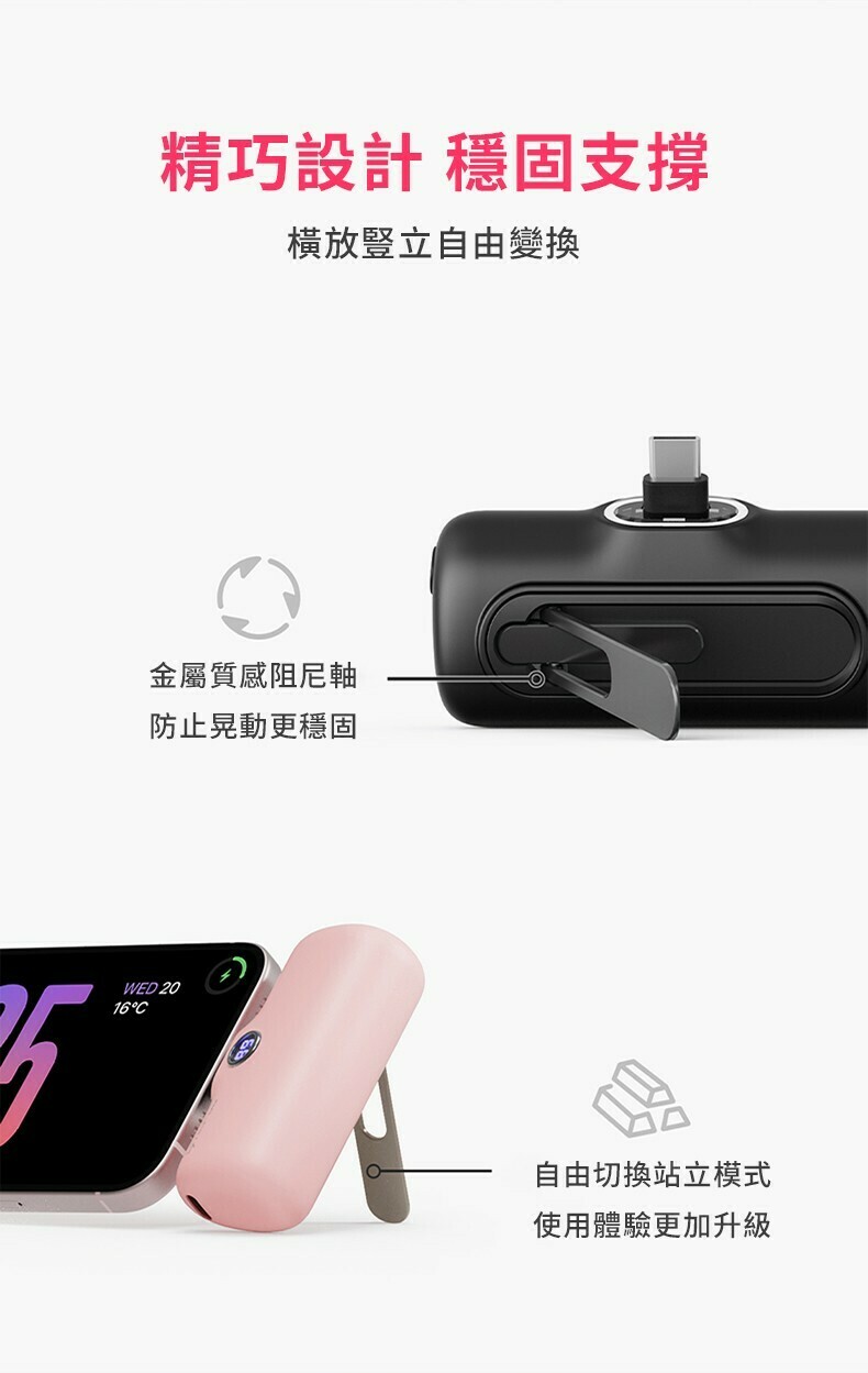 內建可折疊金屬支架,混合快充、便攜式優點,可充 iPhone手機,支架可輕鬆調節到不同角度,堅固耐用不會斷裂,為使用者提供完美的觀看體驗。 無論是學習、工作、看影片時都能解放雙手!
