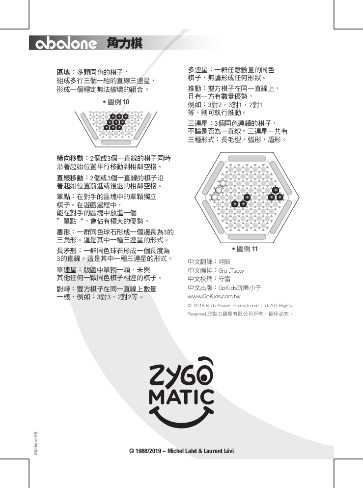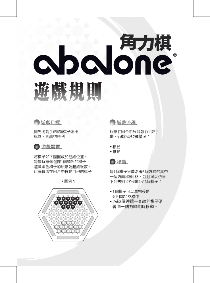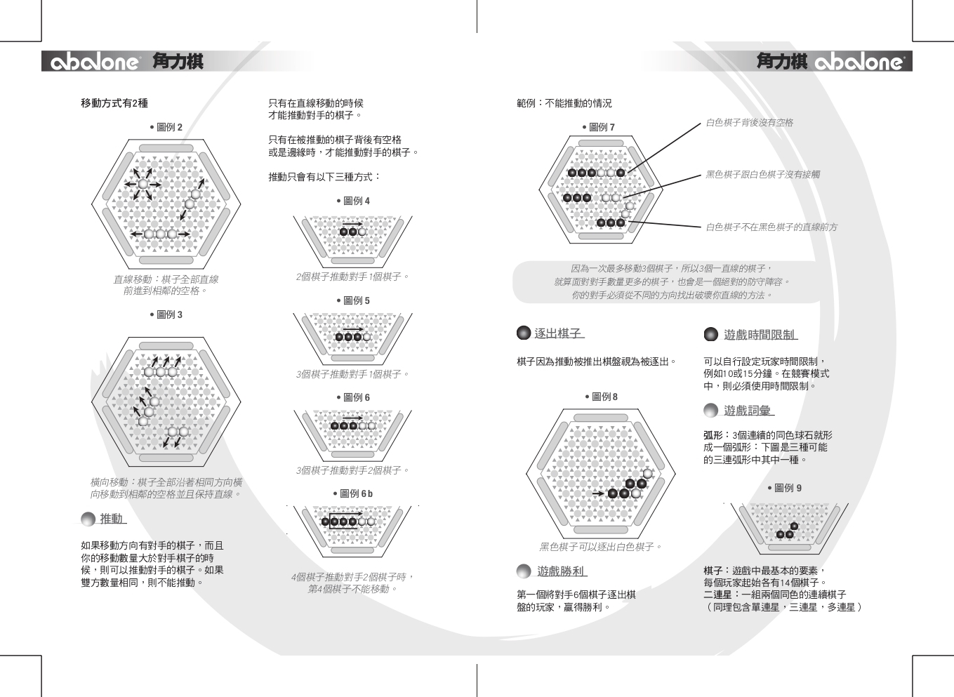 在這簡約富有時尚感的棋盤存在著劍拔弩張的黑白大軍。玩家們輪流推動圍繞在棋盤上的彈珠,目標將對方的六個彈珠推離棋盤。而推動彈珠的動力取決於,一排彈珠的數量,較重一方的彈珠可沿著軸將對方的彈珠推離棋盤,然而,玩家們必須運用機智完美地預測六個可能的方向藉此保護自己。