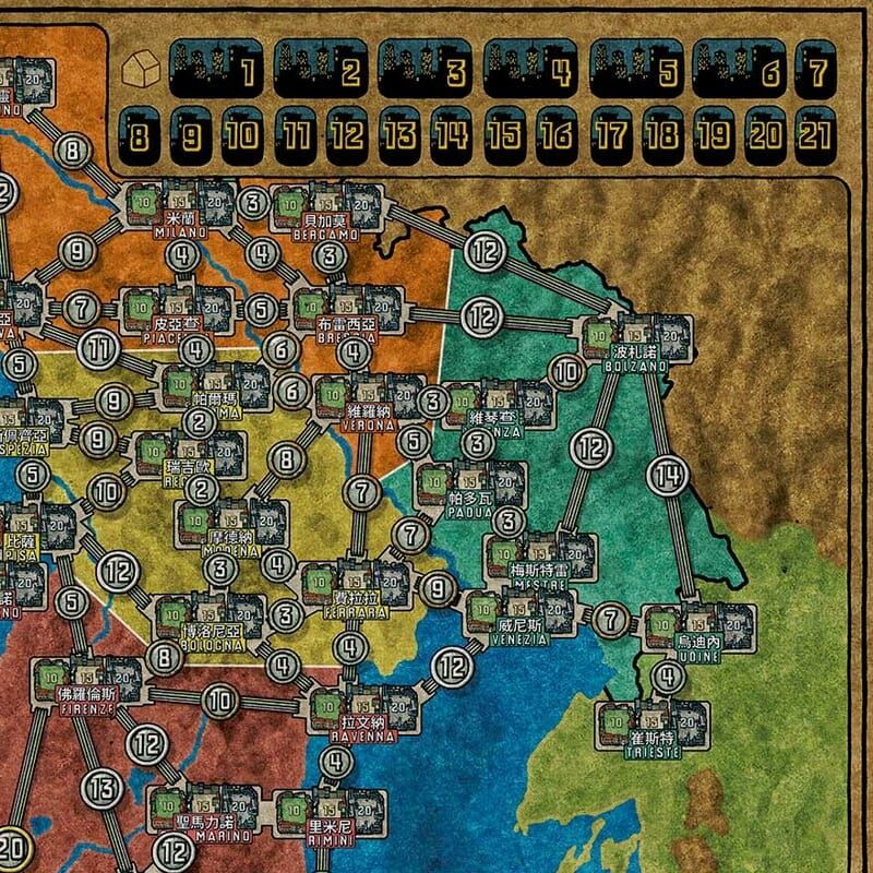 義大利:在義大利,燃料的補充量十分有限,煤與石油的價格會急速攀升。加上地形造成某些城市間的線路費用昂貴,玩家將明顯地感受到資金的匱乏。